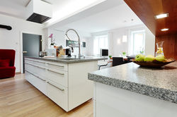 Diese Hofschwaiger-Küche lädt mit Kamin und Sitzmöglichkeit zum Verweilen ein.