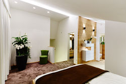 Ein Schlafzimmer im "Hotel-Stil" mit Wohlfühl-Teppich und Effekt-Beleuchtung.